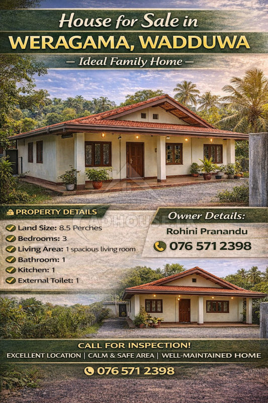 This is a wonderful opportunity to own a comfortable and well-located house in the peaceful residential area of Weragama, Wadduwa. Surrounded by a calm neighborhood and friendly community, this property is ideal for family living, rental investment, or a holiday home.