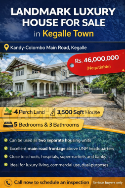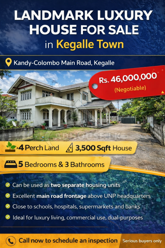 💎 An exceptional opportunity to own a prestigious and spacious residence located in one of Kegalle’s most prominent and valuable locations. Perfectly positioned along the highly sought-after Kandy – Colombo main road, this stately property offers unmatched convenience, excellent visibility, and outstanding long-term investment potential.