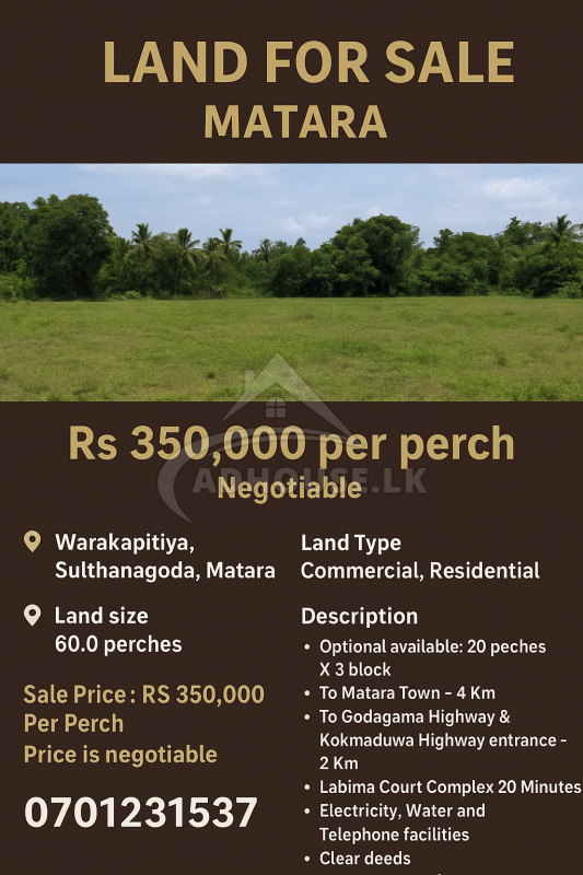 This is an excellent opportunity to acquire a valuable land parcel in a fast-developing area of Matara, suitable for both commercial and residential purposes. Located in a peaceful and green environment, this property offers the perfect balance between urban convenience and calm living, making it ideal for housing projects, commercial developments, investment purposes, or a private residence 🌱🏡